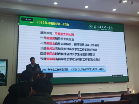 讲座伊始,张亮副教授紧扣“员工工作品牌培育与申报”这一主题,结合自身经历,从“2016年以来的基本情况”、“2022年申报的总体印象”、“员工工作品牌培育的体会”三个方面系统梳理了近年来我省高校员工工作品牌申报的基本特征,畅谈了对员工工作品牌培育与创新的现实体会。他指出,高校辅导员要立足自身工作职责开展工作实践与理论研究,通过员工工作品牌、辅导员工作室等平台建设助力辅导员专业化、职业化发展,助力员工成长成才。