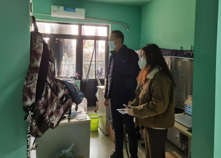 在南苑22栋B区员工寝室,彭飞、曾磊、叶长才、肖桃李等院领导详细询问同学们的学习情况;细心叮嘱同学们天气寒冷,注意及时增减衣物,预防感冒;要注意寝室用电安全,避免发生用电起火等情况;要做好室内消杀工作,定期通风,注意卫生;离校途中做好个人防护,注意出行安全。