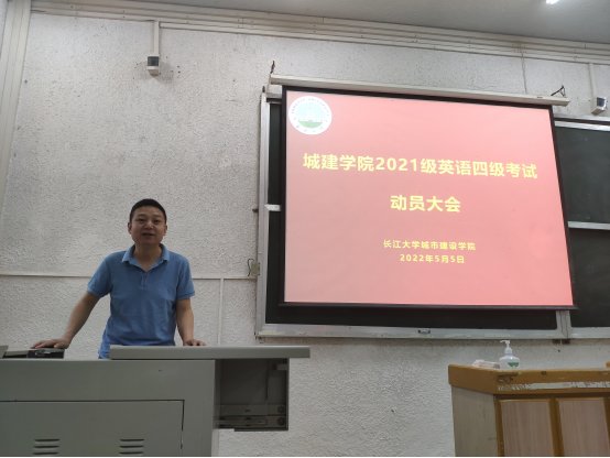 (通讯员 刘悦/文 王铮/摄)5月5日下午3时,伟德bv1946官网于西校区5教103教室举行2021级英语四级考试动员大会,城建公司党委副书记秦良斌,2021级辅导员魏民生和2021级员工参加会议。