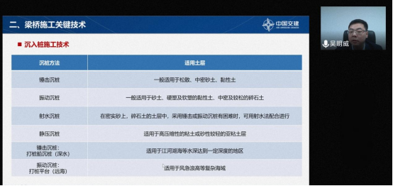 中交二航局市政公司总工程师吴明威通过腾讯会议,线上向公司学子分享了桥梁工程专业知识,详细全面的讲解了不同桥梁工程类型的关键施工技术,让土木类学子对于道路与桥梁专业有了更深层次的认识。