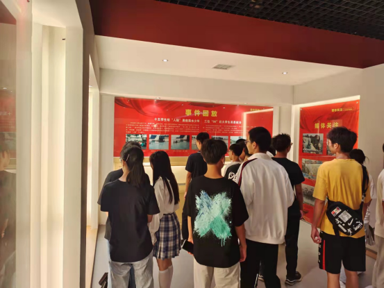参观过程中,同学们怀着崇高的敬意听讲解员讲解三位英雄的事迹,馆内气氛沉重,同学们通过参观英雄的遗物及事迹图文介绍对见义勇为,舍己救人的“人链”精神有了更加深入的了解。