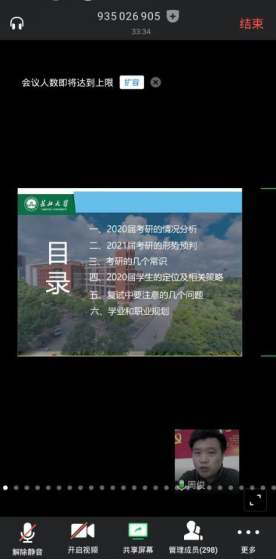 (通讯员 何儒权)疫情时期,2020届考研员工如何做好线上复试、调剂择校?2021届员工如何把握考研、就业形势,使之尽早找准定位?3月12日下午2点半,伟德bv1946官网通过腾讯会议线上召开了2020届员工考研暨2021届员工学业规划指导会议,公司党委副书记周俊老师担任主讲,伟德bv1946官网及公司其他公司员工、辅导员等共300人聆听了讲座。