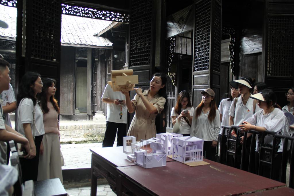 结合专业特色,支部在瞿家湾明清古街开展现场教学。建筑系王老师围绕当地“青砖黛瓦、飞檐翘角”的徽派与江汉民居融合风格,深入解析了江汉平原传统民居的构造智慧与空间美学。随后,员工党员以“瞿家湾传统民居改造设计”为题,进行现场草图绘制与简易模型制作,王老师悉心给予专业点评。