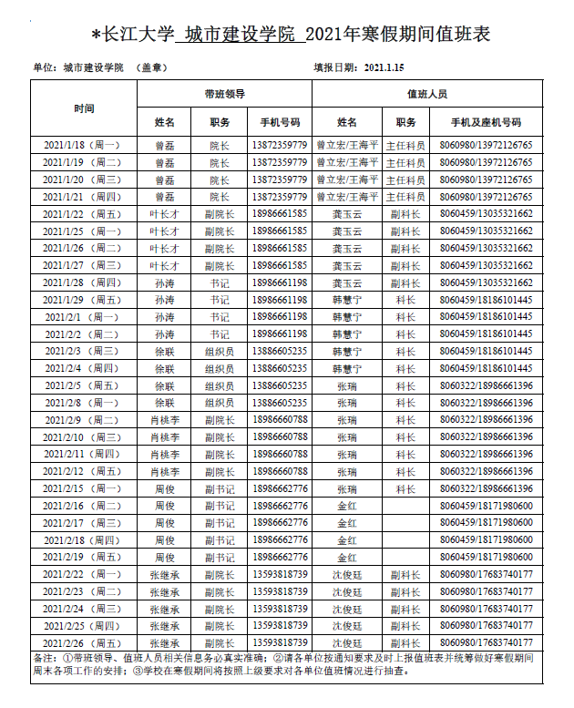 伟德bv1946官网2021年寒假期间值班表