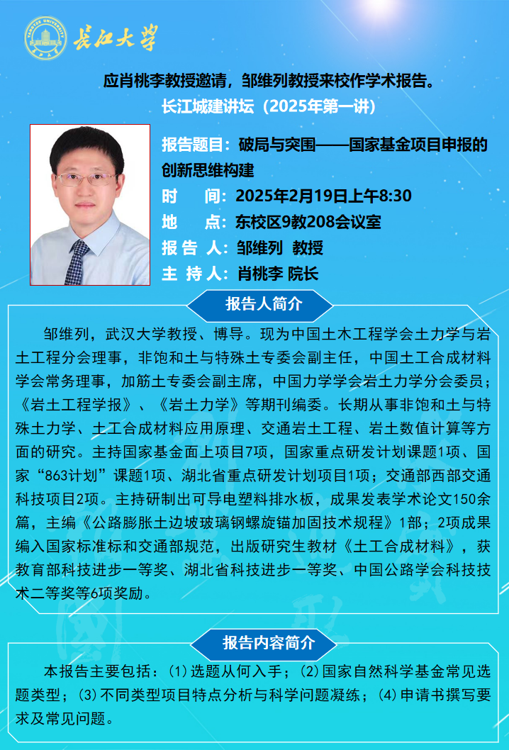 长江城建讲坛2025年第一讲:破局与突围——国家基金项目申报的创新思维构建