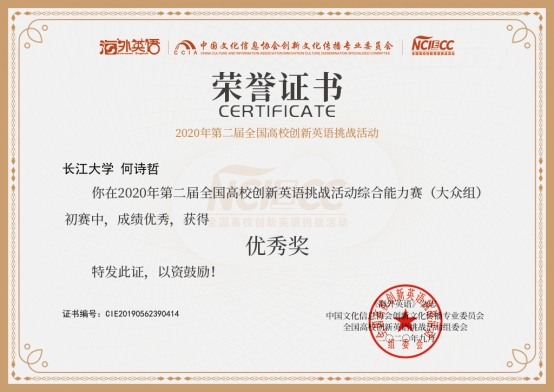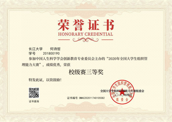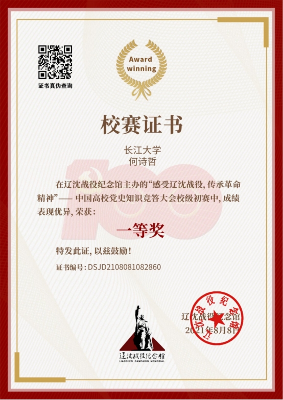 何诗哲: 2020年第二届全国高校创新英语挑战活动综合能力赛(大众组)优秀奖, “2020年全国老员工组织管理能力大赛”校级赛三等奖 , “感受辽沈战役,传承革命精神”—中国高公司党史知识竞答大会校级初赛一等奖