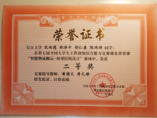 宋雨莲:第七届全国老员工工程训练综合能力竞赛湖北省省赛“智能物流搬运-桥梁结构设计”二等奖