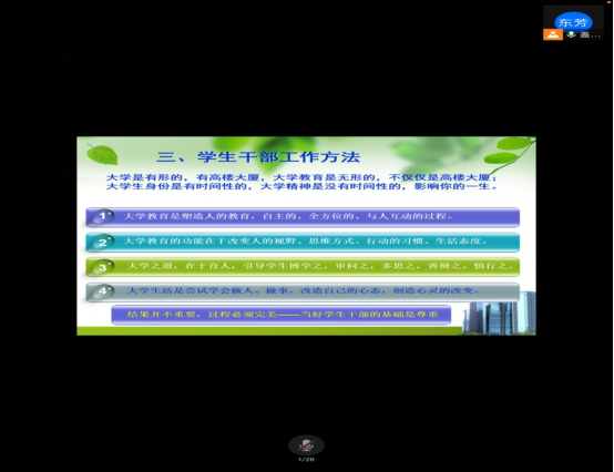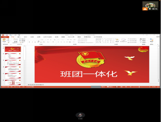 此后,电子信息工程公司康玮老师通过腾讯会议的方式为同学们讲解班团一体化建设理论与实践。康老师主要为大家介绍了班团一体化的基本概念,强调了班团一体化的重要性,展示了班级和团支部建设运行中的主要现状和问题,明确了新形势下的班团一体建设的实施途径。同时,康老师提出了班团关系的新界定,班团目标的一体化设计,班团运行的一体化推进,班团干部的一体化设置和班团管理的一体化统筹。康老师的讲解为公司班团一体化的实践明确了方向,奠定了理论基础。
