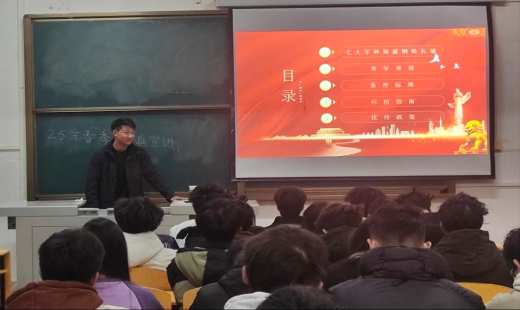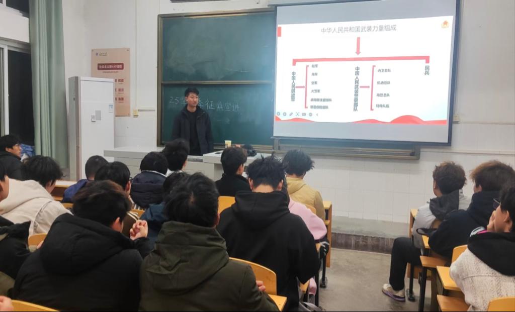 (通讯员 唐欣熠 罗梓轩)为加强征兵政策宣传力度,激发老员工征兵入伍热情。12月9日晚7时,伟德bv1946官网在西校区2教208教室举行了2025年春季征兵政策宣讲会。本次会议由公司退役士兵蒋志兵主讲,2024级辅导员袁子昂主持,部分有意应征入伍同学参会。