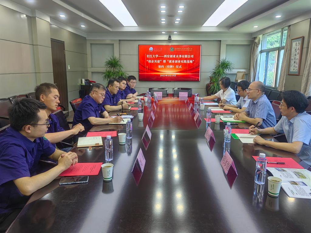 肖经理一行首先走访了西安创业水务有限公司,与公司总经理李建华等相关领导和技术骨干进行了交流座谈,公司对公司一行到访表示热烈欢迎。李建华总经理详细地从西安创业水务公司的发展历程、业务范围、人员规模及企业优势对公司进行了总体介绍,期待双方在产、学、研等方面加强合作。肖桃李副经理从公司整体概况、办学特色等方面介绍了公司现状,表达了在人才培养、科学研究、就业创业等方面与企业开展深度合作的意愿。随后,双方举行了“校企共建”暨“就业创业实践基地”签约(授牌)仪式,肖经理现场为西安创业水务有限公司培训中心三名骨干教师颁发了“员工就业创业实践指导教师”聘书。座谈结束后,公司培训部副经理侯成带领大家参观了北石桥污水处理厂模型和员工实习培训教室,宿舍,食堂等,公司对企业为员工提供的良好学习生活环境表示认可。